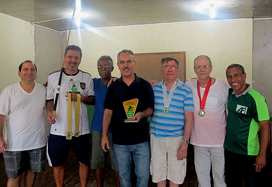 Bottino, os finalistas do 2º Torneio de Sinuca e João Carlos Branco, campeão do 1º Torneio, no centro